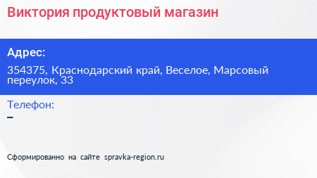 Виктория, продуктовый магазин по адресу 354375, Краснодарский край, Веселое, Марсовый переулок, 33 в дальнейшем Организация, размещена в следующих категориях: