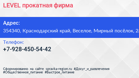 LEVEL, прокатная фирма по адресу 354340, Краснодарский край, Веселое, Мирный посёлок, 2а в дальнейшем Организация, размещена в следующих категориях: