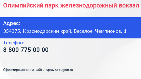 Олимпийский парк, железнодорожный вокзал по адресу 354375, Краснодарский край, Веселое, Чемпионов, 1 в дальнейшем Организация, размещена в следующих категориях: