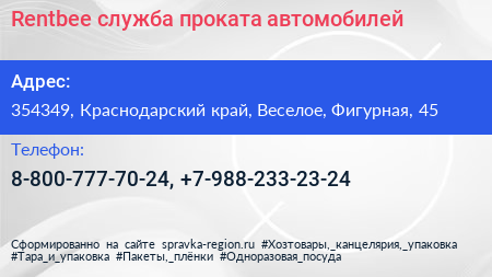 Rentbee, служба проката автомобилей по адресу 354349, Краснодарский край, Веселое, Фигурная, 45 в дальнейшем Организация, размещена в следующих категориях: