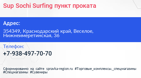 Sup Sochi Surfing, пункт проката по адресу 354349, Краснодарский край, Веселое, Нижнеимеретинская, 36 в дальнейшем Организация, размещена в следующих категориях: