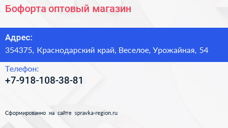 Бофорта, оптовый магазин по адресу 354375, Краснодарский край, Веселое, Урожайная, 54 в дальнейшем Организация, размещена в следующих категориях: