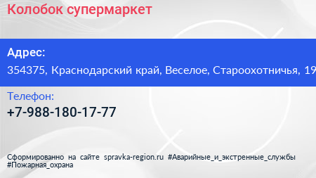 Колобок, супермаркет по адресу 354375, Краснодарский край, Веселое, Староохотничья, 19 в дальнейшем Организация, размещена в следующих категориях:
