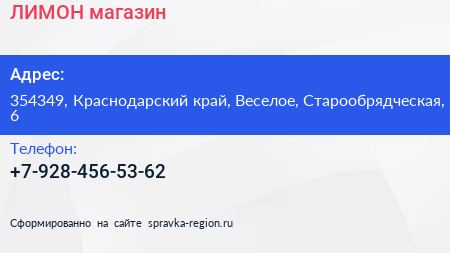 ЛИМОН, магазин по адресу 354349, Краснодарский край, Веселое, Старообрядческая, 6 в дальнейшем Организация, размещена в следующих категориях: