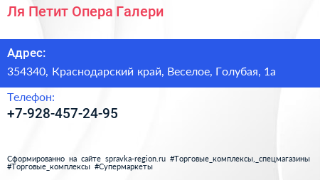 Ля Петит Опера Галери по адресу 354340, Краснодарский край, Веселое, Голубая, 1а в дальнейшем Организация, размещена в следующих категориях: