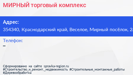 МИРНЫЙ, торговый комплекс по адресу 354340, Краснодарский край, Веселое, Мирный посёлок, 2а в дальнейшем Организация, размещена в следующих категориях: