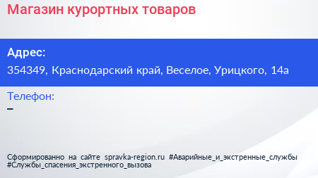 Магазин курортных товаров по адресу 354349, Краснодарский край, Веселое, Урицкого, 14а в дальнейшем Организация, размещена в следующих категориях: