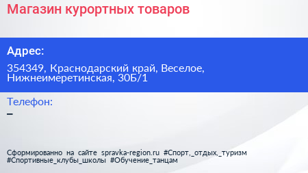 Магазин курортных товаров по адресу 354349, Краснодарский край, Веселое, Нижнеимеретинская, 30Б/1 в дальнейшем Организация, размещена в следующих категориях: