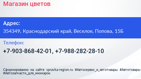 Магазин цветов по адресу 354349, Краснодарский край, Веселое, Попова, 15Б в дальнейшем Организация, размещена в следующих категориях: