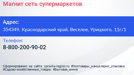 Магнит, сеть супермаркетов по адресу 354349, Краснодарский край, Веселое, Урицкого, 11г/1 в дальнейшем Организация, размещена в следующих категориях: