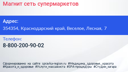 Магнит, сеть супермаркетов по адресу 354354, Краснодарский край, Веселое, Лесная, 7 в дальнейшем Организация, размещена в следующих категориях: