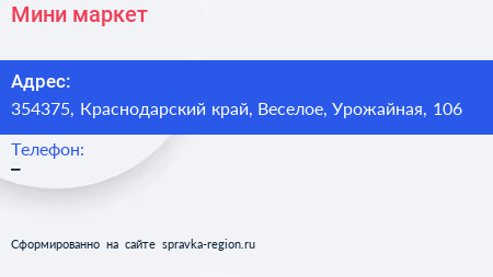 Мини-маркет по адресу 354375, Краснодарский край, Веселое, Урожайная, 106 в дальнейшем Организация, размещена в следующих категориях: