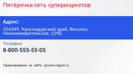 Пятёрочка, сеть супермаркетов по адресу 354349, Краснодарский край, Веселое, Нижнеимеретинская, 129Б в дальнейшем Организация, размещена в следующих категориях: