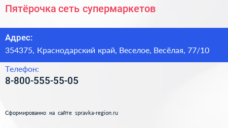 Пятёрочка, сеть супермаркетов по адресу 354375, Краснодарский край, Веселое, Весёлая, 77/10 в дальнейшем Организация, размещена в следующих категориях:
