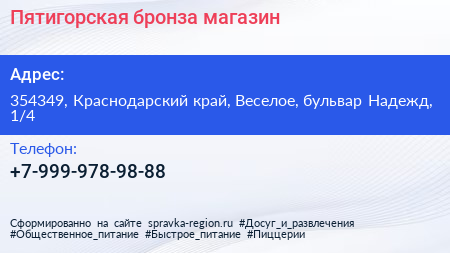 Пятигорская бронза, магазин по адресу 354349, Краснодарский край, Веселое, бульвар Надежд, 1/4 в дальнейшем Организация, размещена в следующих категориях: