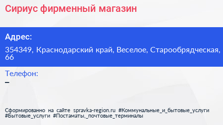 Сириус, фирменный магазин по адресу 354349, Краснодарский край, Веселое, Старообрядческая, 66 в дальнейшем Организация, размещена в следующих категориях: