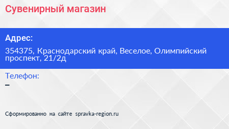 Сувенирный магазин по адресу 354375, Краснодарский край, Веселое, Олимпийский проспект, 21/2д в дальнейшем Организация, размещена в следующих категориях: