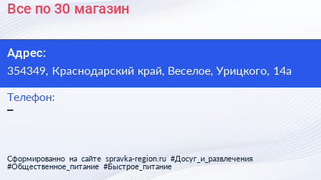 Все по 30, магазин по адресу 354349, Краснодарский край, Веселое, Урицкого, 14а в дальнейшем Организация, размещена в следующих категориях: