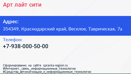 Арт-лайт-сити по адресу 354349, Краснодарский край, Веселое, Таврическая, 7а в дальнейшем Организация, размещена в следующих категориях: