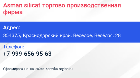 Asman silicat, торгово-производственная фирма по адресу 354375, Краснодарский край, Веселое, Весёлая, 28 в дальнейшем Организация, размещена в следующих категориях: