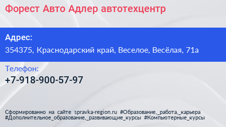Форест-Авто Адлер, автотехцентр по адресу 354375, Краснодарский край, Веселое, Весёлая, 71а в дальнейшем Организация, размещена в следующих категориях: