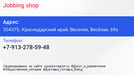 Jobbing shop по адресу 354375, Краснодарский край, Веселое, Весёлая, 69а в дальнейшем Организация, размещена в следующих категориях: