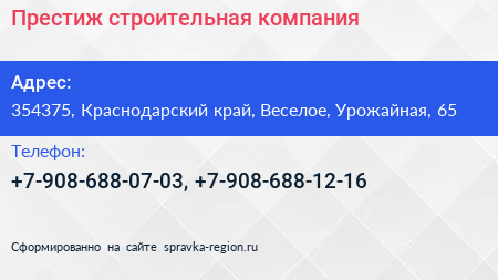 Престиж, строительная компания по адресу 354375, Краснодарский край, Веселое, Урожайная, 65 в дальнейшем Организация, размещена в следующих категориях:
