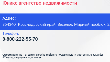 Юникс, агентство недвижимости по адресу 354340, Краснодарский край, Веселое, Мирный посёлок, 2а в дальнейшем Организация, размещена в следующих категориях: