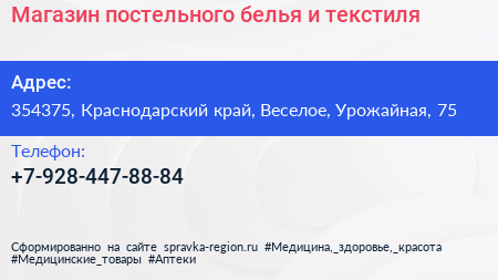 Магазин постельного белья и текстиля по адресу 354375, Краснодарский край, Веселое, Урожайная, 75 в дальнейшем Организация, размещена в следующих категориях: