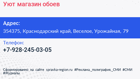 Уют, магазин обоев по адресу 354375, Краснодарский край, Веселое, Урожайная, 79 в дальнейшем Организация, размещена в следующих категориях: