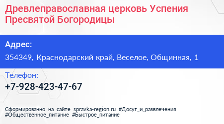 Древлеправославная церковь Успения Пресвятой Богородицы по адресу 354349, Краснодарский край, Веселое, Общинная, 1 в дальнейшем Организация, размещена в следующих категориях: