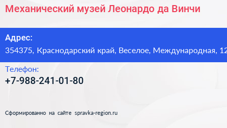 Механический музей Леонардо да Винчи по адресу 354375, Краснодарский край, Веселое, Международная, 12 в дальнейшем Организация, размещена в следующих категориях: