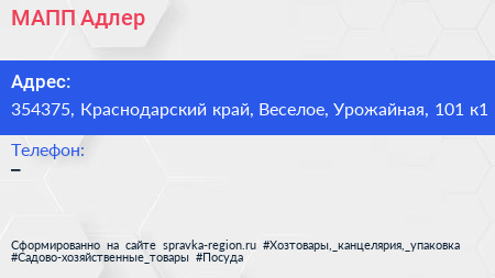 МАПП Адлер по адресу 354375, Краснодарский край, Веселое, Урожайная, 101 к1 в дальнейшем Организация, размещена в следующих категориях: