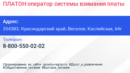 ПЛАТОН, оператор системы взимания платы по адресу 354383, Краснодарский край, Веселое, Каспийская, 64г в дальнейшем Организация, размещена в следующих категориях: