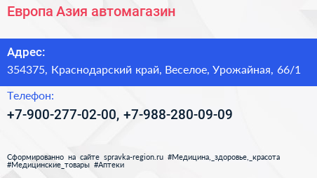 Европа & Азия, автомагазин по адресу 354375, Краснодарский край, Веселое, Урожайная, 66/1 в дальнейшем Организация, размещена в следующих категориях: