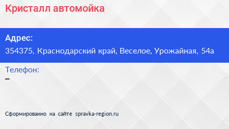 Кристалл, автомойка по адресу 354375, Краснодарский край, Веселое, Урожайная, 54а в дальнейшем Организация, размещена в следующих категориях: