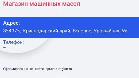 Магазин машинных масел по адресу 354375, Краснодарский край, Веселое, Урожайная, 9в в дальнейшем Организация, размещена в следующих категориях: