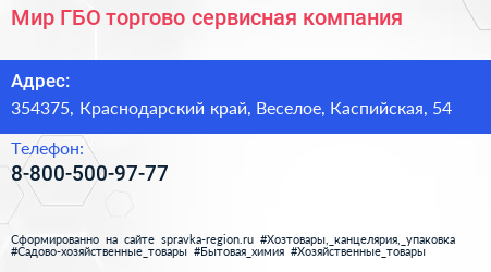 Мир ГБО, торгово-сервисная компания по адресу 354375, Краснодарский край, Веселое, Каспийская, 54 в дальнейшем Организация, размещена в следующих категориях: