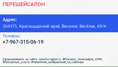 ПЕРЕШЕЙСАЛОН по адресу 354375, Краснодарский край, Веселое, Весёлая, 69/4 в дальнейшем Организация, размещена в следующих категориях:
