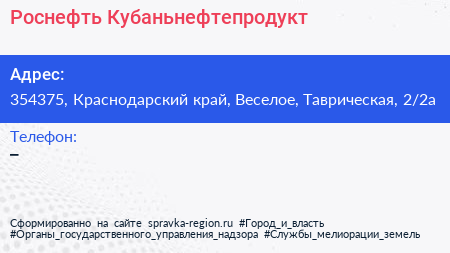 Роснефть-Кубаньнефтепродукт по адресу 354375, Краснодарский край, Веселое, Таврическая, 2/2а в дальнейшем Организация, размещена в следующих категориях: