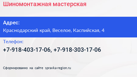 Шиномонтажная мастерская по адресу Краснодарский край, Веселое, Каспийская, 4 в дальнейшем Организация, размещена в следующих категориях: