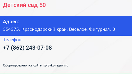 Детский сад №50 по адресу 354375, Краснодарский край, Веселое, Фигурная, 3 в дальнейшем Организация, размещена в следующих категориях: