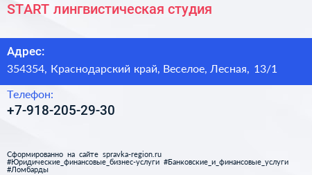 START, лингвистическая студия по адресу 354354, Краснодарский край, Веселое, Лесная, 13/1 в дальнейшем Организация, размещена в следующих категориях: