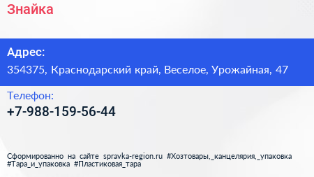 Знайка по адресу 354375, Краснодарский край, Веселое, Урожайная, 47 в дальнейшем Организация, размещена в следующих категориях: