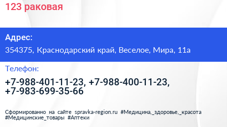 123, раковая по адресу 354375, Краснодарский край, Веселое, Мира, 11а в дальнейшем Организация, размещена в следующих категориях: