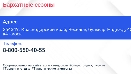 Бархатные сезоны по адресу 354349, Краснодарский край, Веселое, бульвар Надежд, 40 к4 киоск в дальнейшем Организация, размещена в следующих категориях: