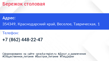 Бережок, столовая по адресу 354349, Краснодарский край, Веселое, Таврическая, 1 в дальнейшем Организация, размещена в следующих категориях: