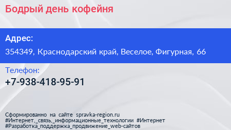 Бодрый день, кофейня по адресу 354349, Краснодарский край, Веселое, Фигурная, 66 в дальнейшем Организация, размещена в следующих категориях: