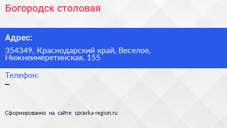Богородск, столовая по адресу 354349, Краснодарский край, Веселое, Нижнеимеретинская, 155 в дальнейшем Организация, размещена в следующих категориях:
