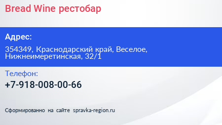 Bread & Wine, рестобар по адресу 354349, Краснодарский край, Веселое, Нижнеимеретинская, 32/1 в дальнейшем Организация, размещена в следующих категориях: